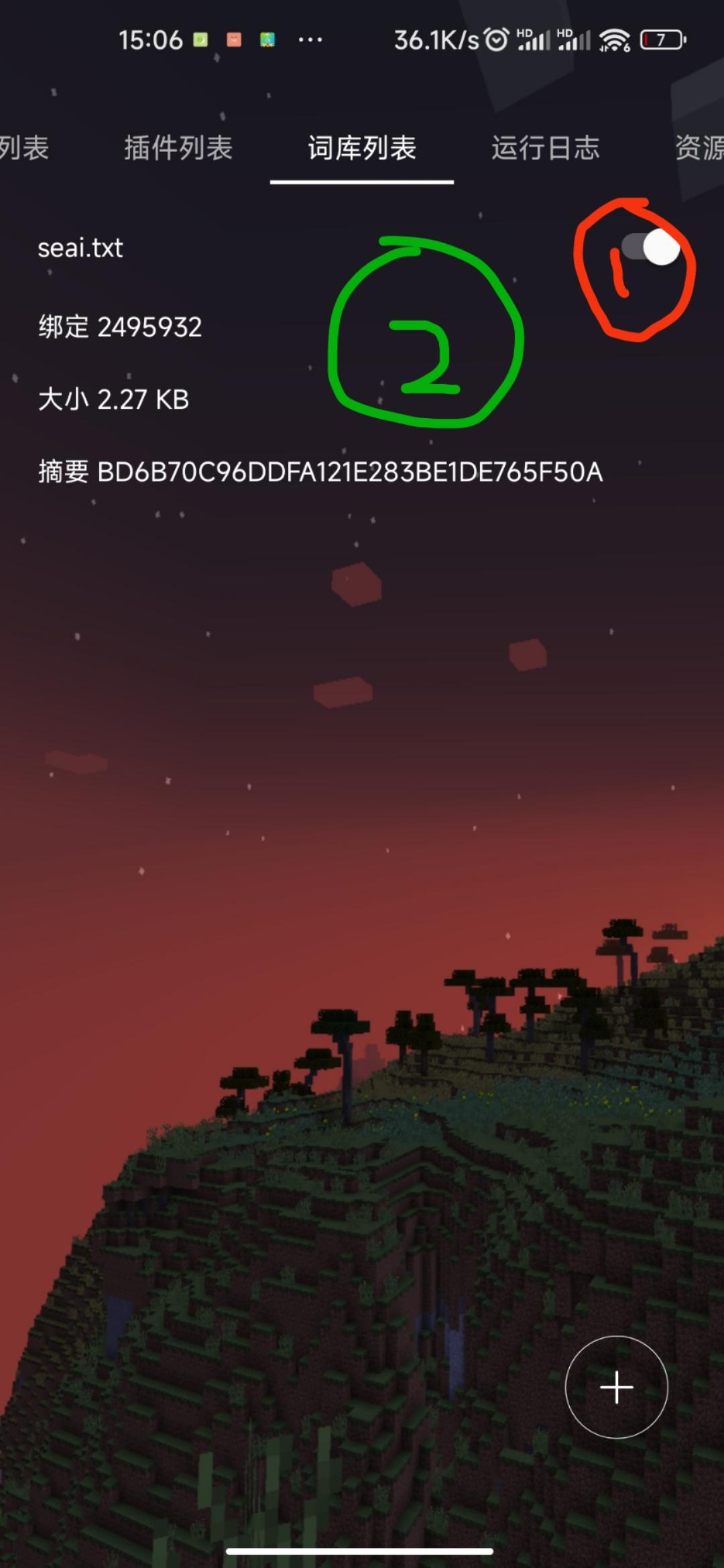 3.导入完后后面都是重点!继续点词库列表,看下面第一张图,点红色圈圈区域打开词库,会提示你绑定机器人QQ绑定即可
