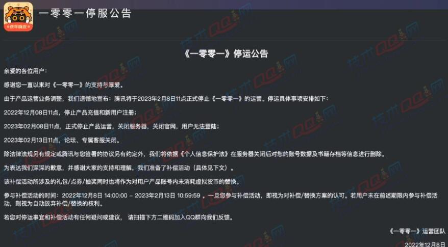 12月8日腾讯互动阅读APP《一零零一》宣布将于2023年2月8日停止运营