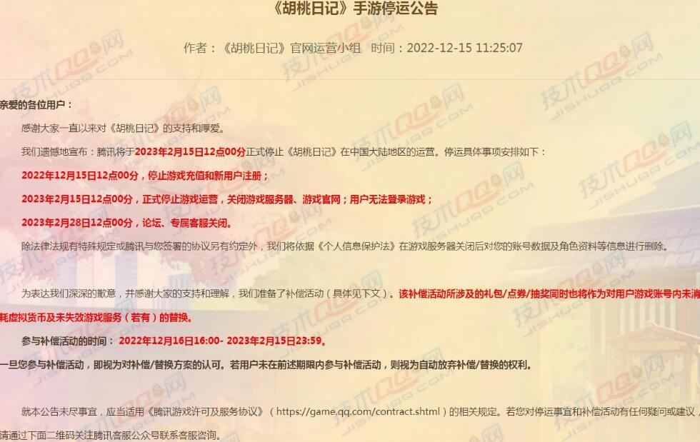 在今天腾讯手游《胡桃日记》宣布将于2023年2月15日停止中国大陆运营
