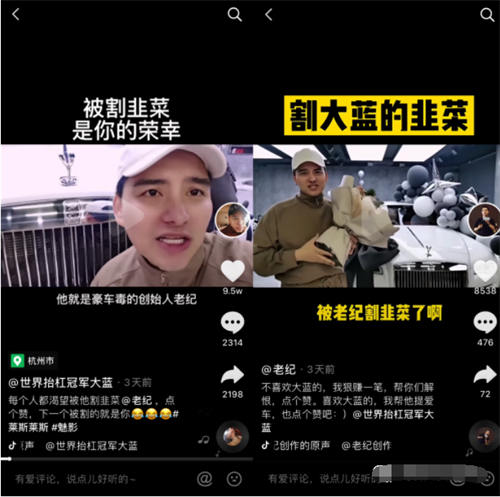 先说个事情,这两天整个短视频圈,包括我的整个朋友圈全部被这件事情刷屏了,就是三天前抖音@世界抬杠冠军大蓝,找抖音@老纪买了一台劳斯莱斯魅影,然后双方互发了一条视频后,居然直接引发了流量狂潮…