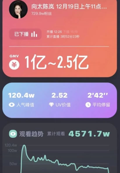 连向太这样的有钱人都在直播了,12 月 19 日,向太陈岚迎来抖音直播首秀,首播破3亿。开播十分钟,直播间就涌入了80万网友观看。直播总时长为 3 小时 52 分钟。